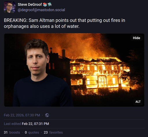 STHayden@piefed.social to Memes@sopuli.xyzEnglish · 1 month agoBREAKING: Sam Altman points out that putting out fires in orphanages also uses a lot of water.media.piefed.socialimagemessage-square2linkfedilinkarrow-up10arrow-down10