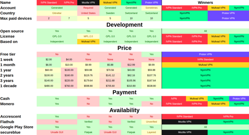 and i think a category should included, that tracks age of vpn or something like that, considering this is nymvpns biggest flaw… still hard to say how trustworthy it is + their software is less battle tested
