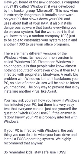 alexei_1917 [mirror/your pronouns]@hexbear.net to Linux@lemmy.mlEnglish · 7 days agoBe on the lookout for this scary piece of malware! Your tech illiterate relatives' PCs are probably already infected!hexbear.netimagemessage-square20fedilinkarrow-up1117arrow-down116