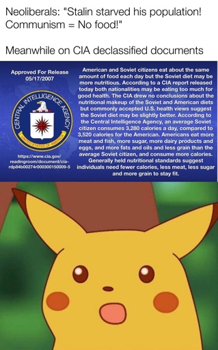 If you actually read the wall of text, it explains that US citizens got more meat, sugar and fats than soviet citizens, who had to make do with grain in place of the higher value foods enjoyed by capitalist wage slaves.