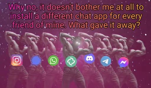 minus-squareDragonTypeWyvern@literature.cafelinkfedilinkarrow-up0·2 years agoFriends don’t make friends install chat apps (besides Signal)